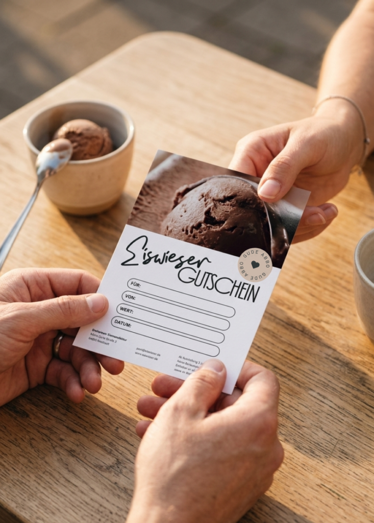 Deinen Gutschein bekommst du direkt nach dem Kauf per Mail als Gutscheincode. Auf Wunsch erhältst du ihn auch als Papiergutschein zum Abholen im Werksverkauf oder als Druckvorlage